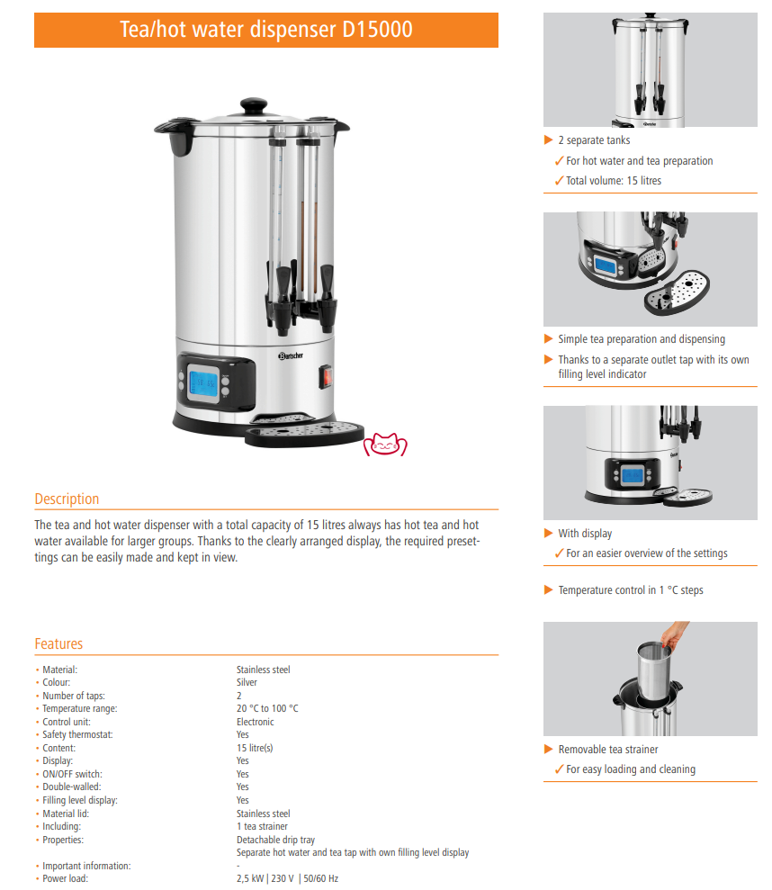 BARTSCHER 200128 D15000 15升开水机,采用先进的温控技术,具备快速加热、稳定输出的核心优势。其15升大容量设计,能够满足大规模聚会、会议、餐饮等场景中对热水的高需求,确保快速且高效的热水分配,帮助提升整体服务效率。此外,设备配备了清晰的显示屏,用户可以直观设置温度,操作简便,避免了繁琐的手动调整,带来了更为流畅的使用体验。
