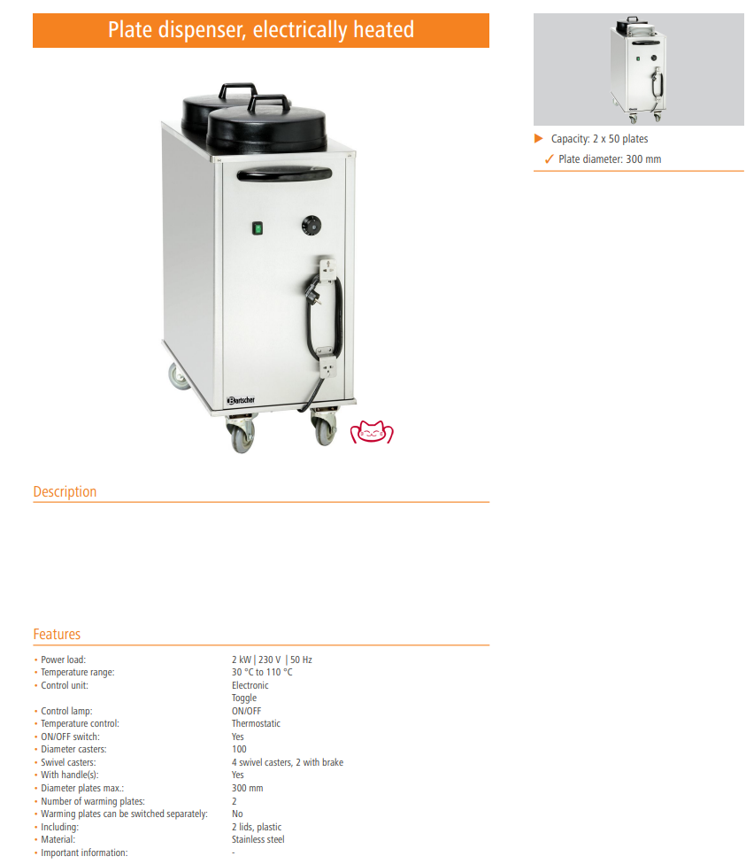 BARTSCHER 103065 暖碟车专为高效餐饮服务而生,可容纳多达100只直径300mm以内的餐盘,温控范围广(30°C-110°C),升温快且均匀,配备刹车脚轮灵活移动,稳定又安全。一次投入,多年稳定运转,真正省心省事。