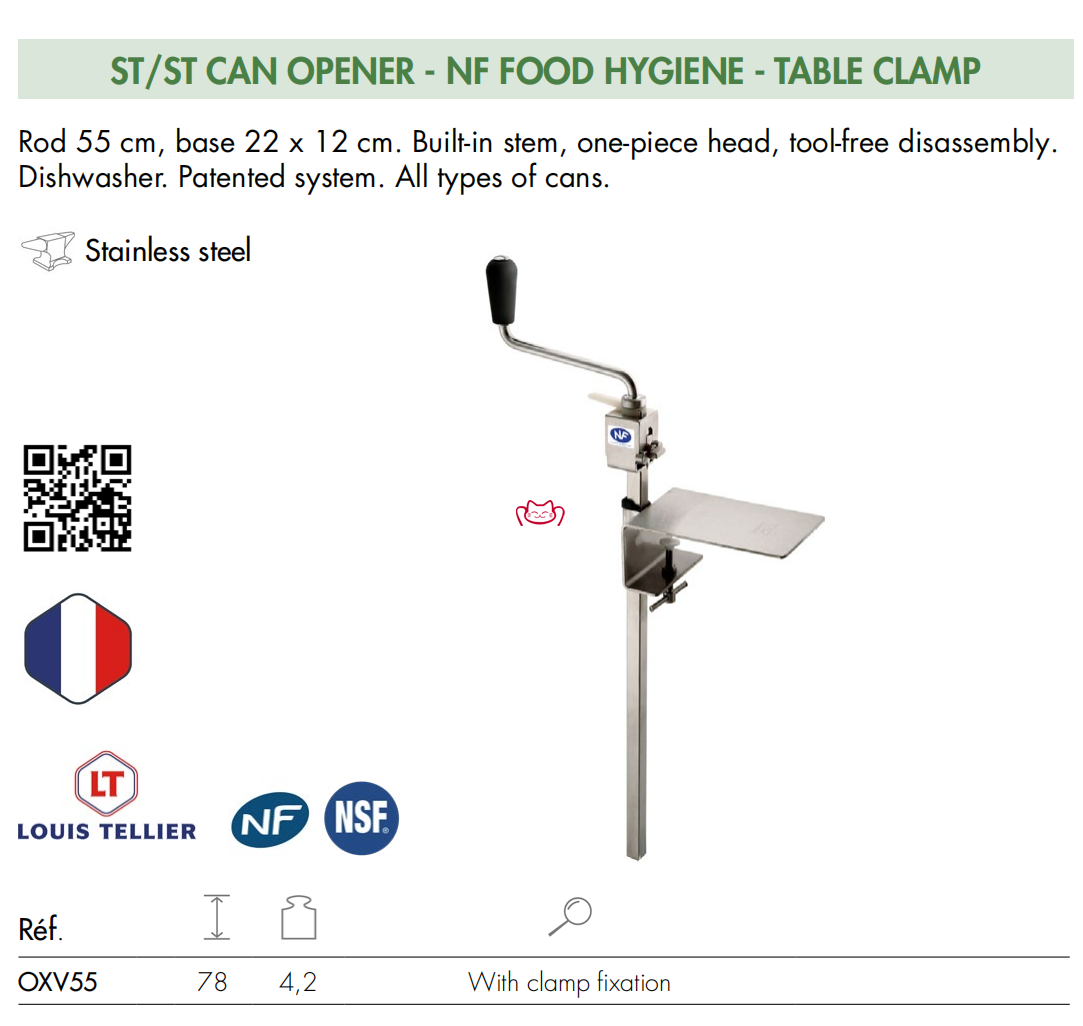 特征: 带夹具固定。耐磨和耐用,它可以轻松打开所有类型的罐头,而无需创造馅料。杆长 55 厘米,底座 22 x 12 厘米。 内置阀杆,一体式头部,免工具拆卸。 可洗碗机洗。 专利系统。