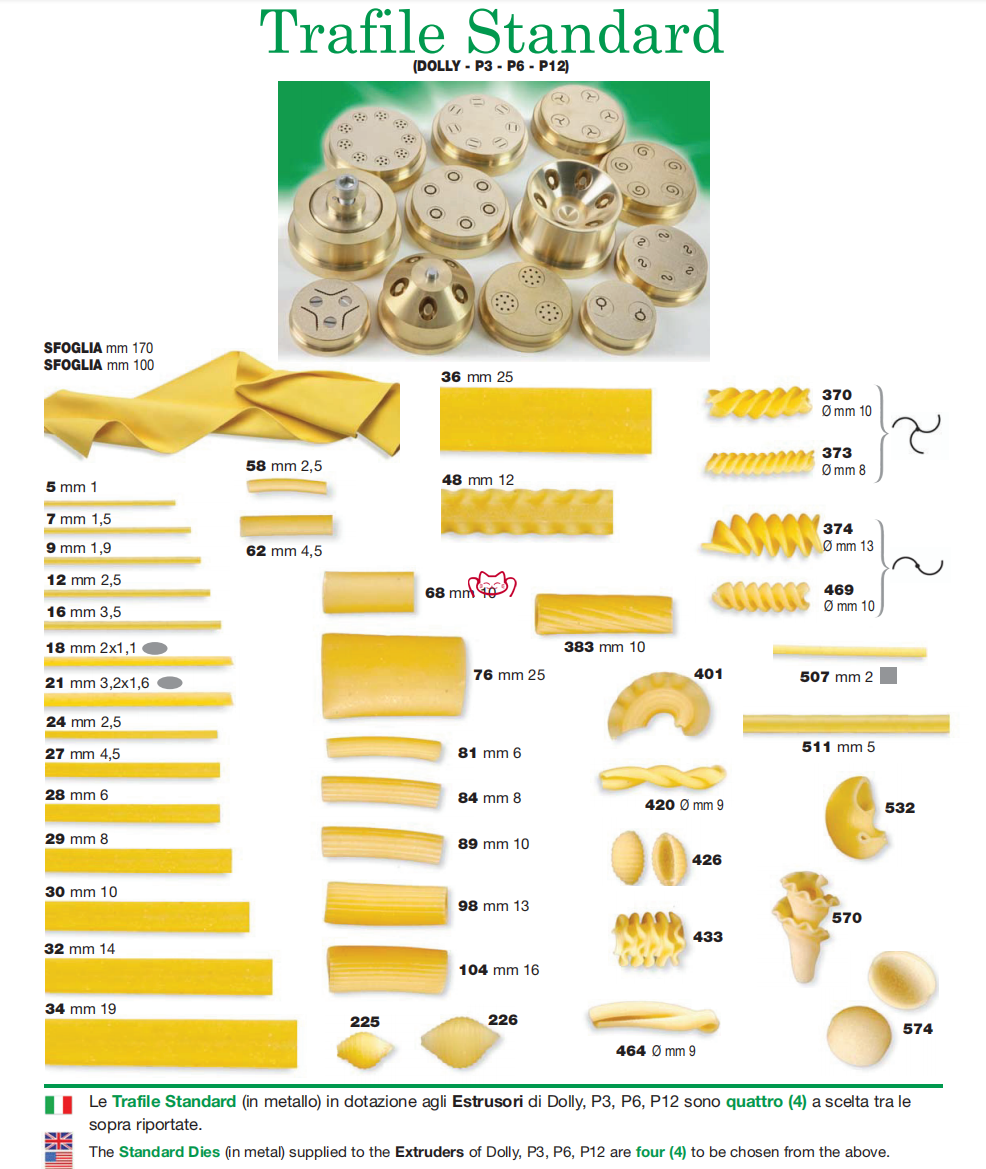 备注:本机配备标配4款制面模具,具体可以从以下STARDARD DIES选择。同时还可选配100多款不同意面模具(详情请点我查看),涵盖各种长意面、短意面、中空意面、创意造型意面等,满足从传统意大利餐厅到现代创意西餐厅的多样化菜单需求。一台机器,即可胜任多款招牌菜出品,助力餐厅灵活调整菜品结构、打造季节限定菜单,提高出品差异化与客户复购率。