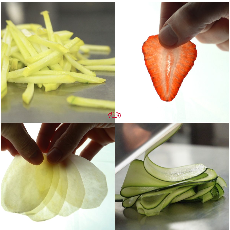 特征:不锈钢(St/St)材质,适合专业厨房精细切割使用。自 1946 年创制,原创设计,专业品质,符合餐饮行业标准.多功能可调切片器(Mandoline),可调切片厚度,支持制作平滑切片或压纹切片+薯条(French fries)+切丝(Julienne).桌边支撑设计,稳固操作。配备 2 组刀片平滑刀片和波纹刀片.配备 防护推手,安全操作.