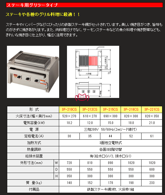 日本HIGO-GRILLER 3P-221CS日式烧烤炉 品牌:HIGO-GRILLER 型号:3P-221CS 规格:1020X600X380MM 电量:380V 21.0KW 工作面:820X350MM 产品视频:请扫描下方微信视频号二维码查看