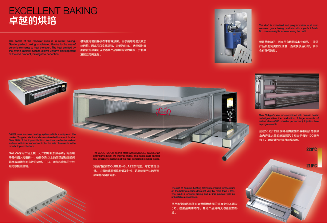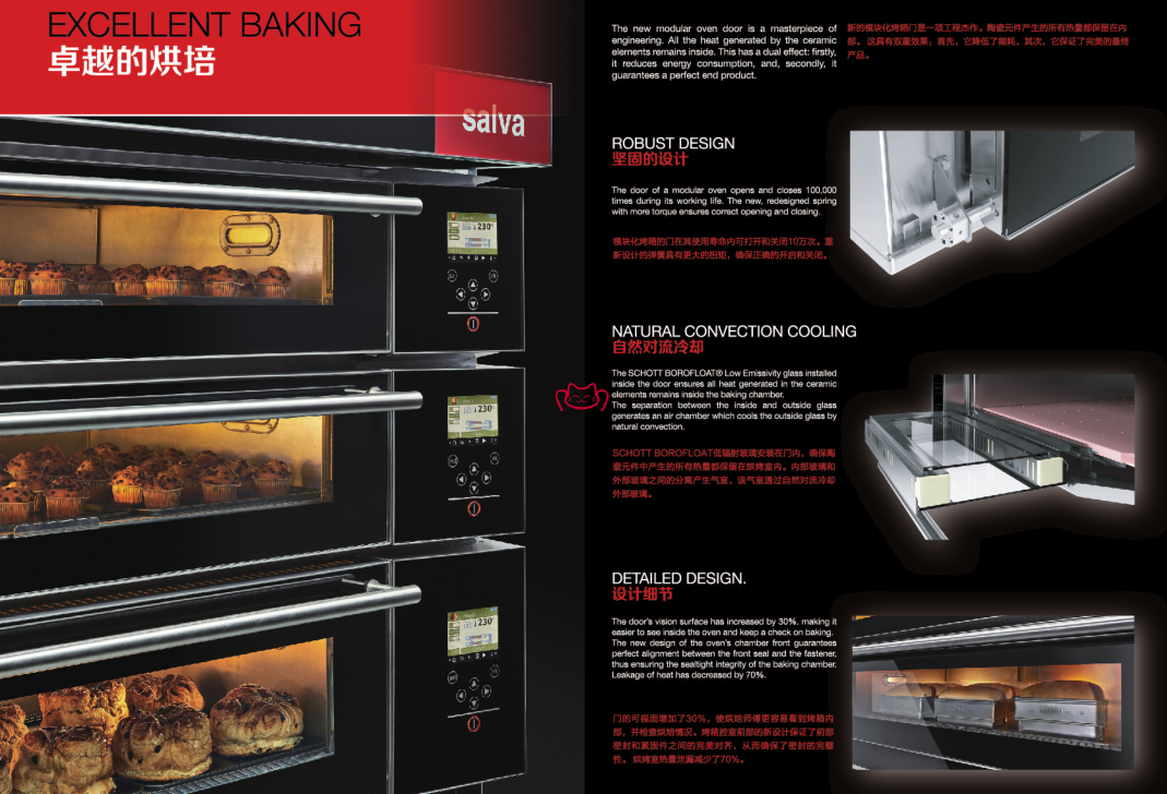 特征:SALVA’s cake-maker modular oven is renowned as the best oven by prestigious artisan bakers around the world. The new door reduces heat loss by 35%, meaning lower energy consumption. The SCHOTT BOROFLOAT ® Low-Emissivity glass used in the doors is cutting-edge German technology in thermal low-emissivity glass.