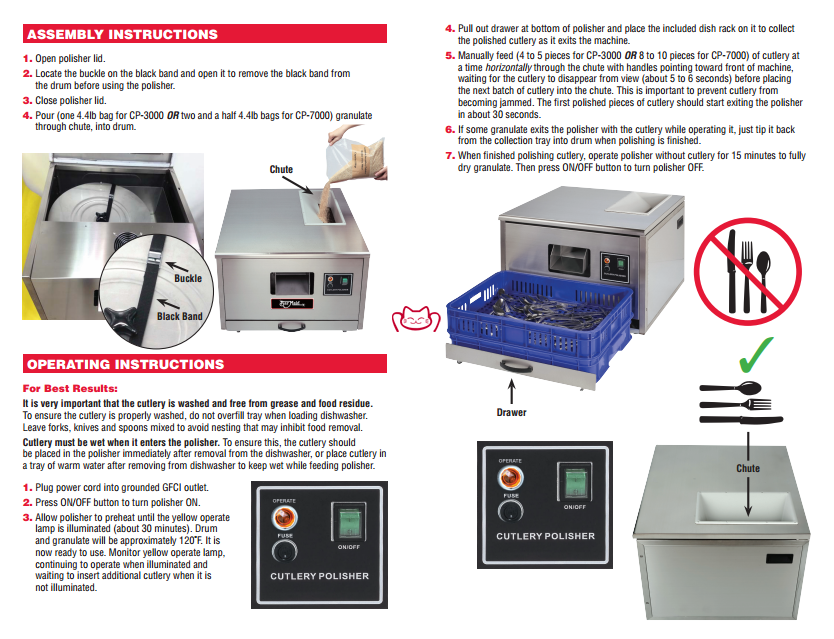 特征: 这款Bar Maid CP-3000餐具烘干机/抛光机可节省人工成本,并使餐具保持闪闪发光。 这种符合人体工学原理的装置每小时可干燥和抛光多达3,000件餐具。 直接在洗碗机外的干或湿餐具上使用它。 该机器结构紧凑,便携,可安装在大多数工作台上,非常适合需要自动抛光但空间较小的应用。要使用,只需每5至10秒在顶部溜槽中装入8-10件湿餐具即可。 通过加热的坡道和振动的结合,加热的有机蔬菜基颗粒(华氏150-170度)可以抛光餐具。 UV-C卫生过程还可以消除细菌,对每块细菌进行灭菌以实现最大安全性。 这款餐具烘干机/抛光机可提供无条纹的明亮光泽,呈现精美的桌面效果.