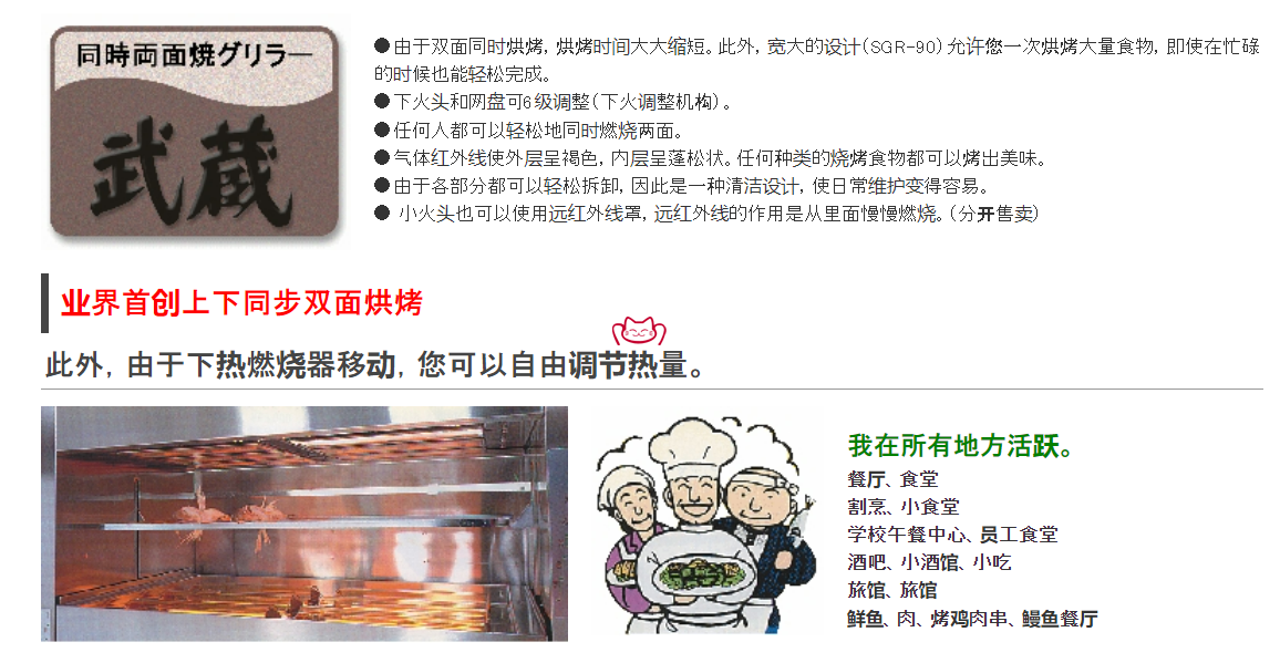 - 双面同时烘烤,缩短烘烤时间。 此外,可以一次大量燃烧的宽大设计(SGR-90)即使在繁忙的时候也很容易。