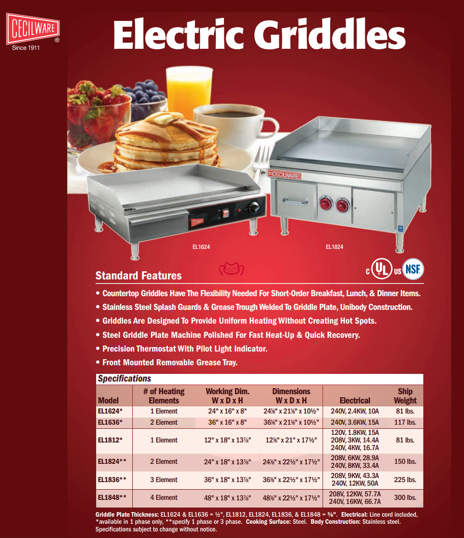 特征:使用 Cecilware EL1636 台面电烤盘烹制热气腾腾的鸡蛋、培根、汉堡等,非常适合空间有限的厨房!这款台面烤盘提供您所需的加热功率,可提供出色的效果,同时保持较小的占地面积。