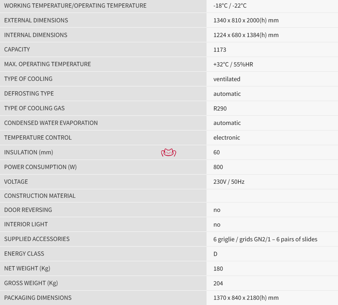 特征:GN2/1 不锈钢冷藏柜,通风制冷 - 集成单元 - 单元内可见蒸发器 - 带绝缘侧面的电机室 - 带数字恒温器的电子温度控制 - 门框周围安装的电加热元件 防止冷凝 - 电机停止除霜 - 冷凝水自动蒸发。 带自动关闭弹簧的双面门 - 带钥匙的门锁 - 免工具可拆卸门垫圈 - 带圆角的腔室底部 - 镀锌板的外部背面和底部面板 - 高度可调的不锈钢脚。