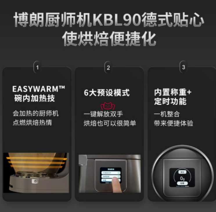 -EasyWarm™ 碗内加热技术,提供精准的加温方案,可直接碗内发酵、融化巧克力、制作蛋白霜等,一机替代发酵箱、水浴锅等
