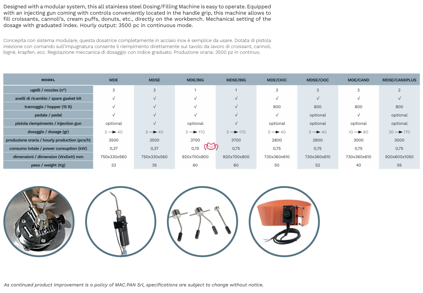 A:刻度 5–40g 适合常见的奶油、酱料、馅料填充(泡芙、甜甜圈、羊角面包等)。若需要更大剂量,MAC.PAN 也有 BIG 系列或可选计量头(例如 5–170g 的选项),按需配置即可。选择前建议提供代表性样品或目标剂量,我们可给出最佳喷嘴/计量头配置建议。