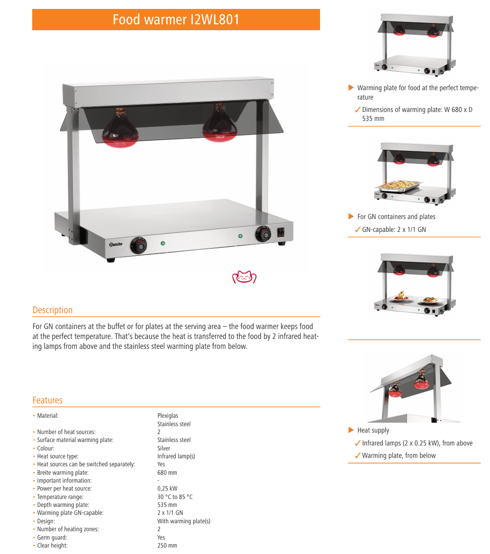 特征:无论是自助餐台的GN餐盒,还是上菜区的餐盘,食物加热器都能保持理想温度。热量通过上方的两盏红外线加热灯和下方的不锈钢保温板传递到食物上。本产品由深圳市招财猫酒店设备用品有限公司官方进口并销售,原厂正品保障。