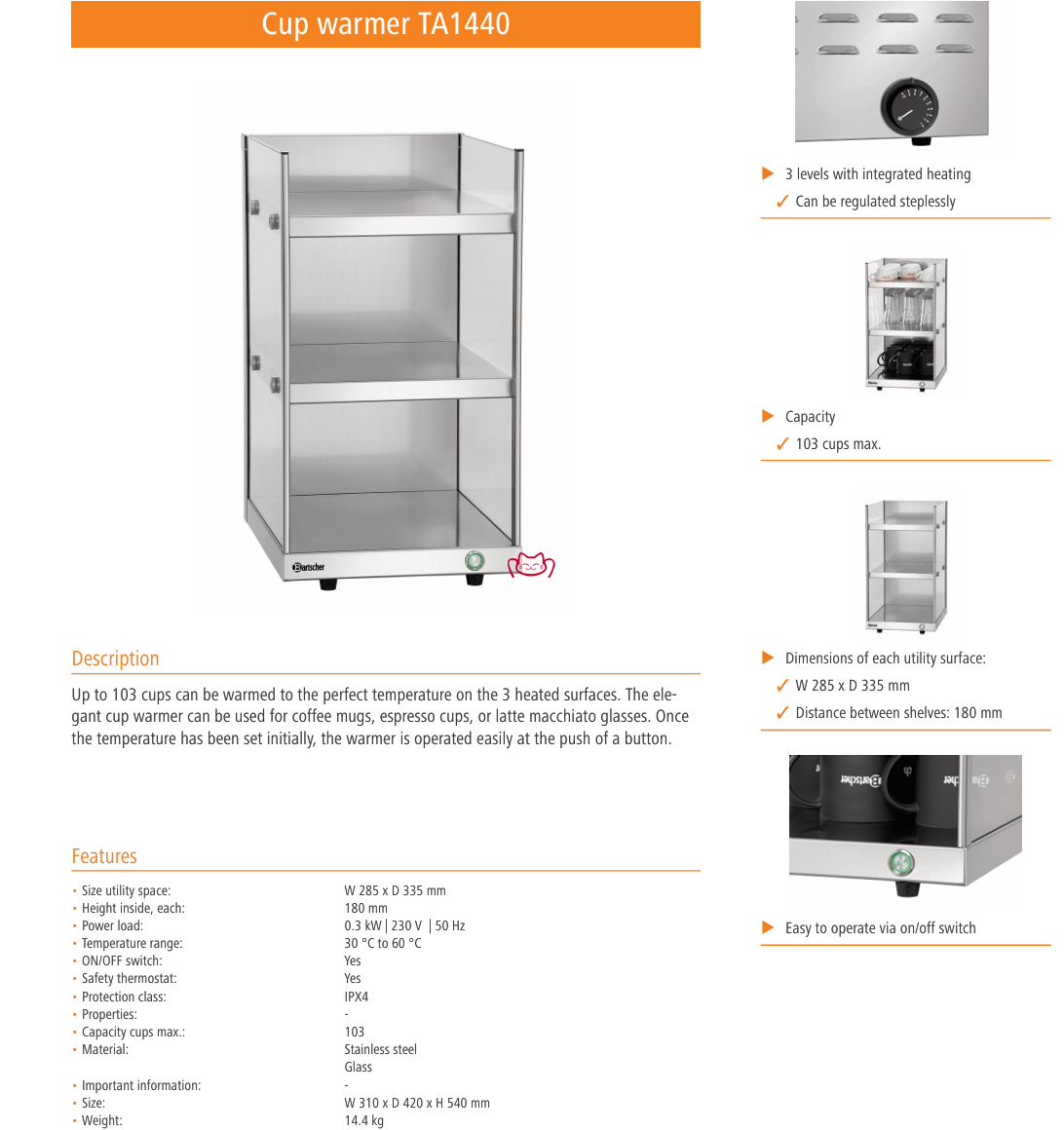 若你的目标是“把每一杯咖啡的第一口品质当作品牌资产来经营”,那选择一台设计用于商用、材料与安全机制到位的暖杯机并不是“多花钱”,而是把未来维修、替换、差评与客流损失的隐性成本一次性买掉。BARTSCHER TA1440(103079)正是为这种把品质当作利润杠杆的客户准备的——短期看形象、长期看复购与人力效率。