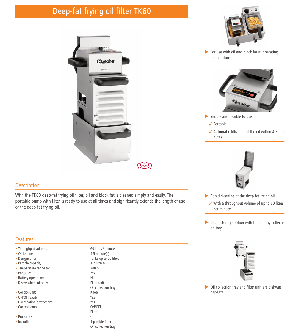 特征:使用 TK60 油炸油过滤器,可以轻松高效地清洁食用油和固体油脂。便携式泵配合过滤器,随时可用,大大延长炸油的使用寿命。