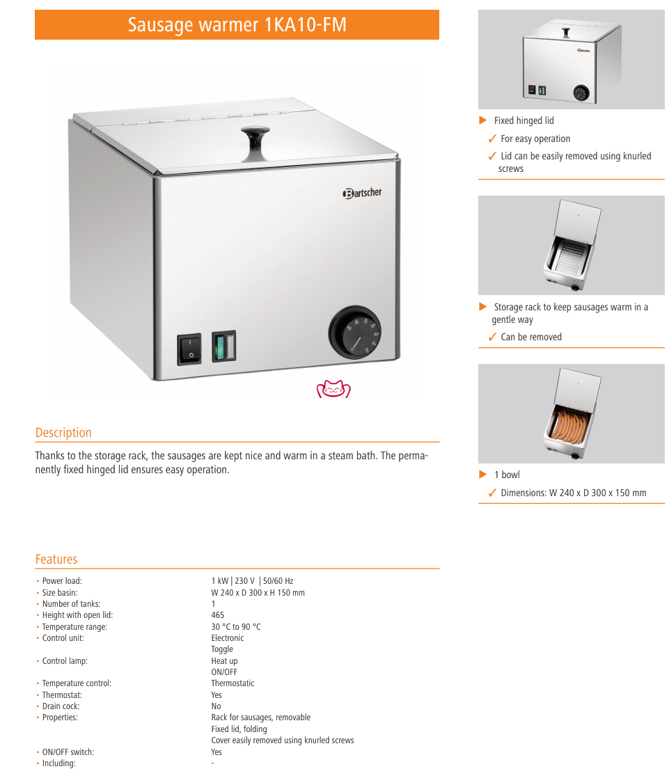 特征:有了储物架,香肠在蒸汽浴中保持温暖舒适。永久固定的铰链盖确保操作简便。