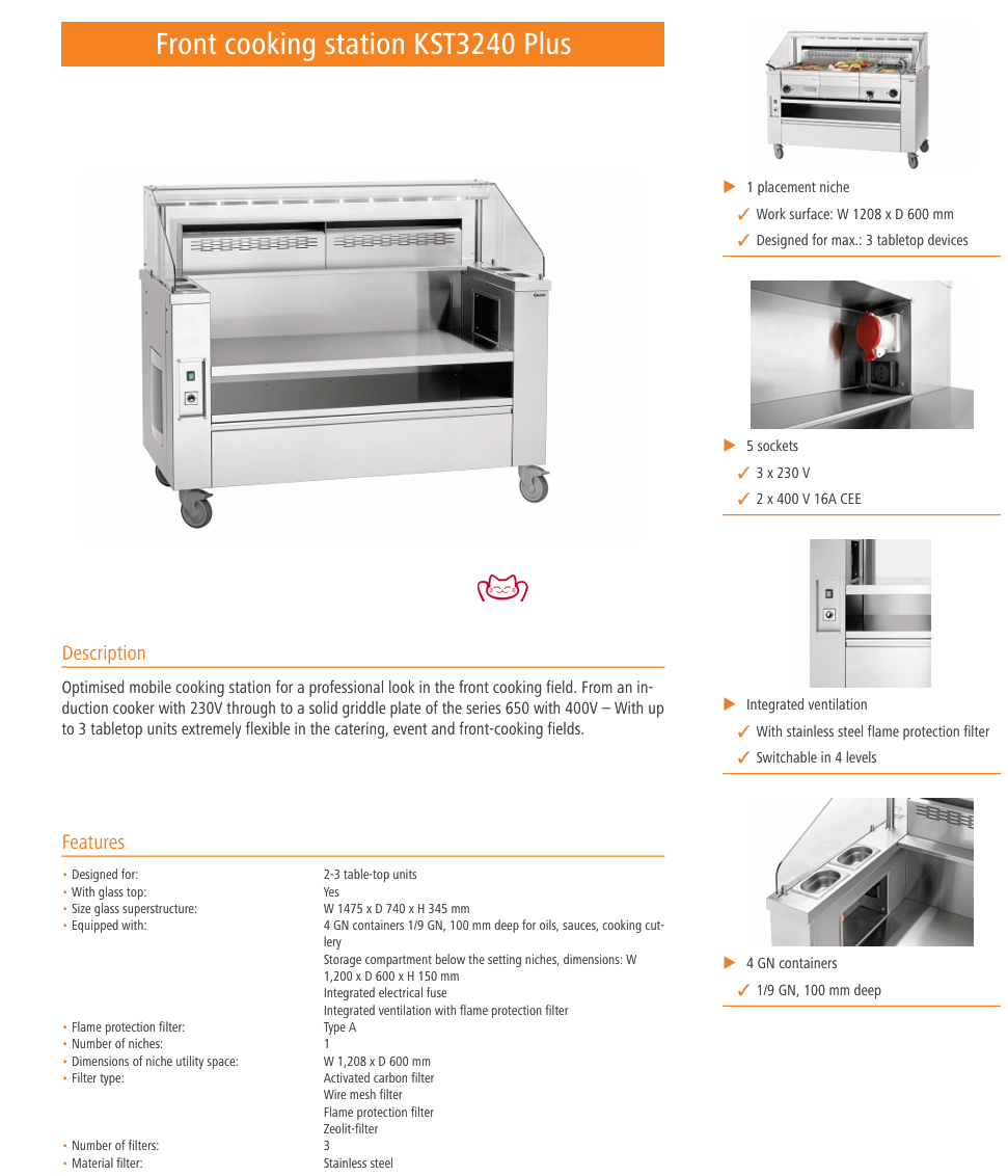 特征:优化的移动烹饪工作站,前台烹饪区域专业外观。可选配 230 V 的电磁炉或系列 650 的 400 V 实心煎板——最多可配 3 个台面单元,在餐饮、活动和前台烹饪领域极为灵活。