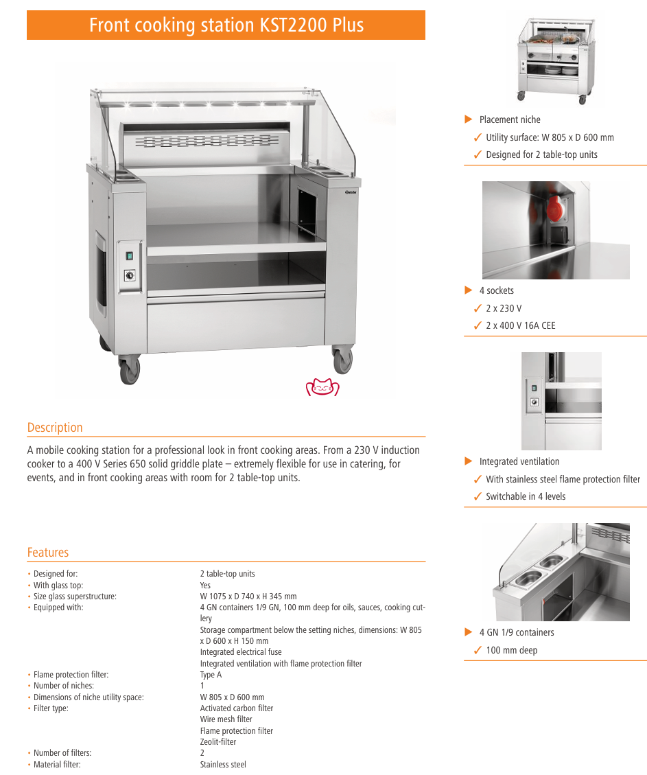 特征:这是一款专为前台烹饪设计的移动烹饪台,可搭配 230 V 电磁炉或 400 V 系列 650 实心煎板,灵活应用于餐饮、活动及前台烹饪场景,支持安装 2 个台面单元。