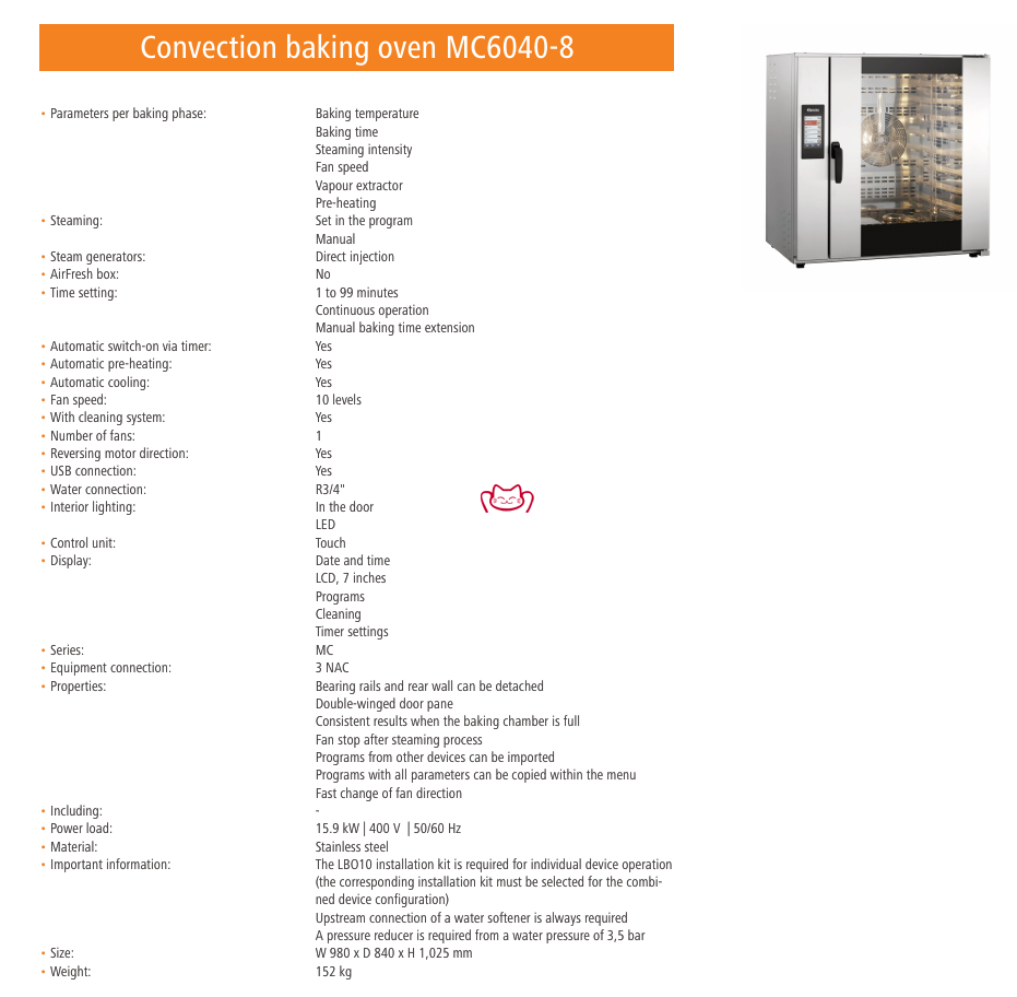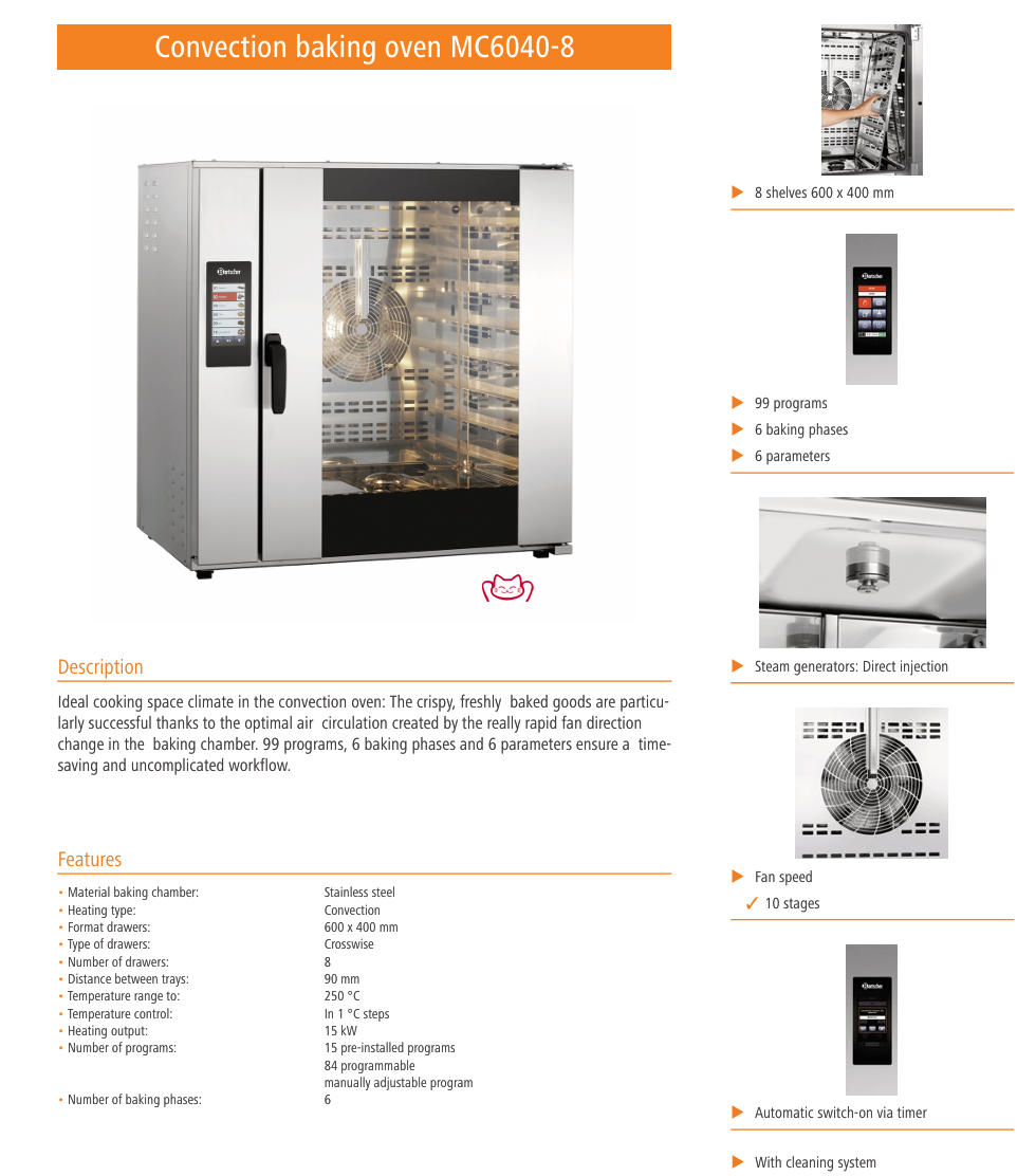 结构特点:可拆卸托盘导轨及后壁 / 双层玻璃门 / 满载均匀烘焙效果 / 蒸汽结束后风机停止 / 可导入外部程序 / 菜单内参数复制 / 快速风向切换