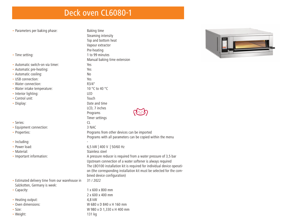 A1:适合且收益明显。CL6080-1 属于单层专业烘焙层炉,单次可放 1×600×800 或 2×600×400 烤盘,温度最高 300°C、加热功率 4.8 kW,总机功率 6.5 kW(400V)。对于日销 150–600 条面包/款的精品面包房或中央厨房的小切线,它能在保证口感与一致性的同时缩短出品调试时间,减少返工。其程序化功能能在员工交接、门店扩张时节省大量管理与培训成本。