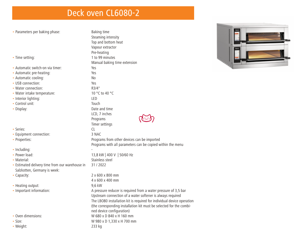 如果您在寻找一台“出品稳定、寿命长、调校精确、并且能把工艺复制到每一个烤盘”的商用层炉,Bartscher CL6080-2(117912)就是为专业面包房、精品烘焙连锁、酒店烘焙部门和中央厨房量身打造的那一台。它的核心价值不是“能用”,而是“好用、耐用、合规——能把利润与风险一并算清楚”。