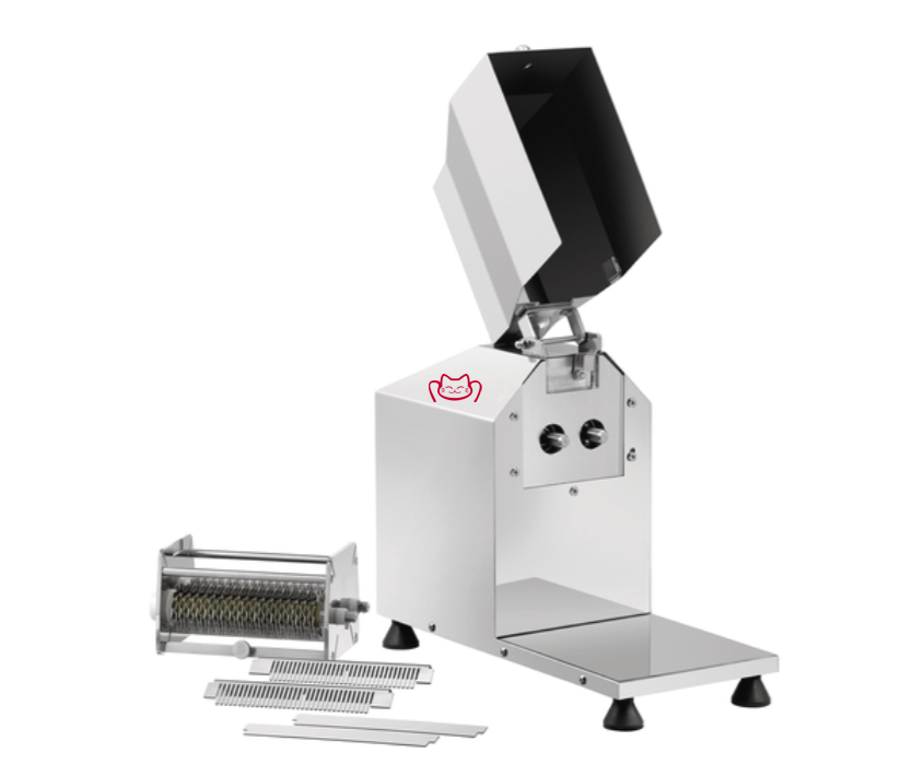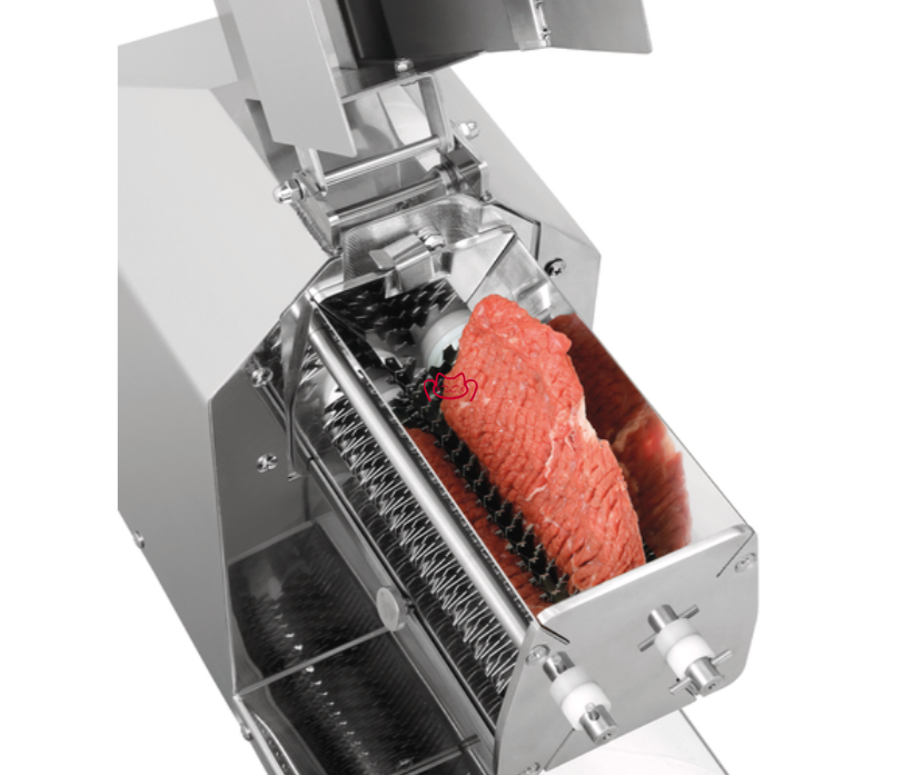 答:机械嫩化的原理是通过薄而密的纹理/穿刺改善肌理、断开筋膜,使肉更易入味而不是“破坏肉片结构”。合适的送入量与操作方法(参见随机的操作手册)可以保证肉片完整、厚度一致,适用于牛排、猪排、鸡排等多种切割方式。A370254 的填充轴尺寸(190×25 mm)与可调送入方式,能控制处理强度。
