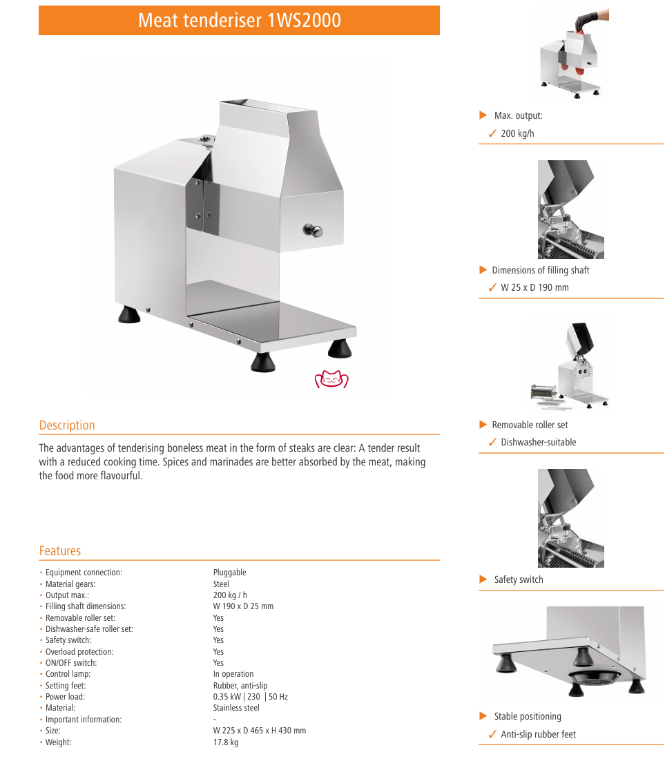 产能与稳定性(节省人工、提升产量):标注的 200 kg/h 最大产能,能让中央厨房或中型餐厅在备餐高峰快速批量化处理肉类,替代大量重复人工敲打或手工修整,降低人工投入与出品波动。