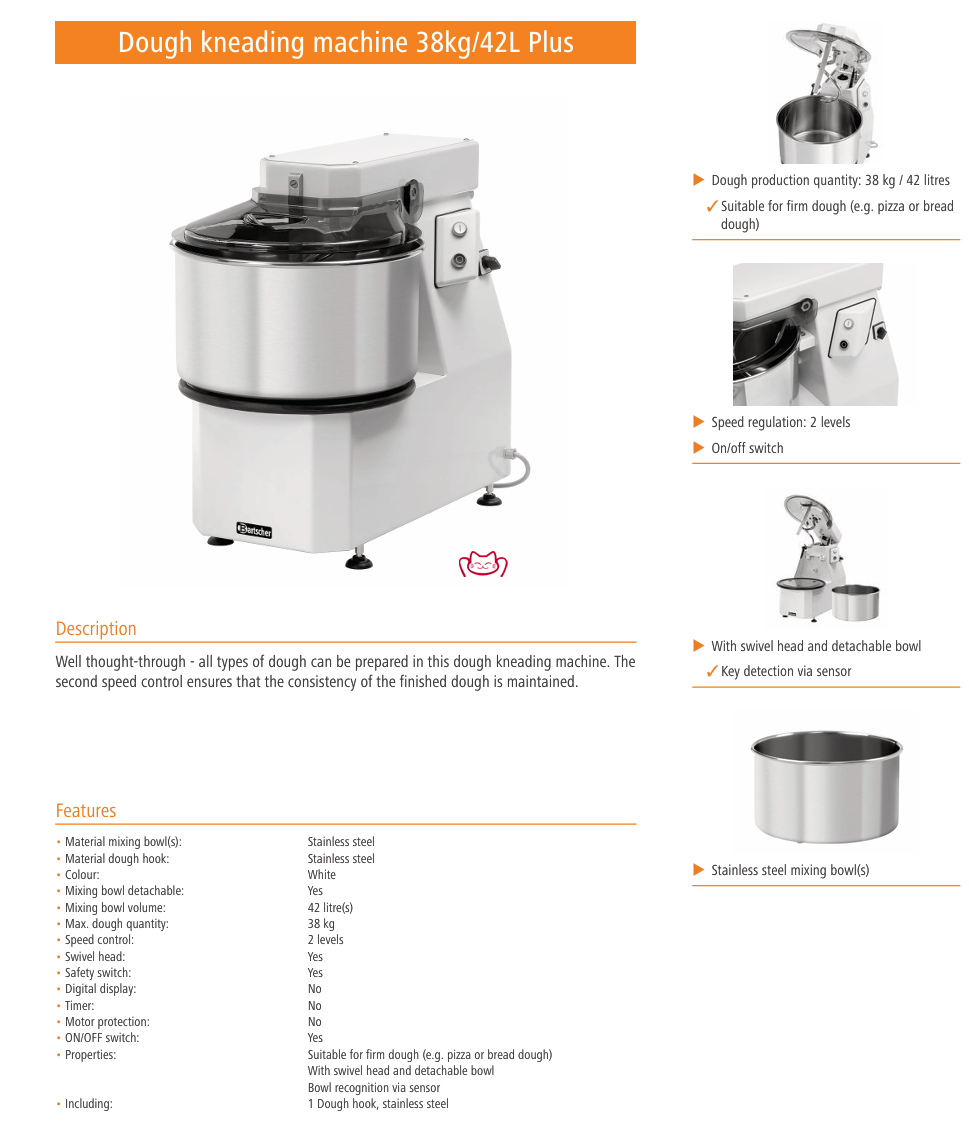 稳定产能与规格匹配运营节拍:最大38kg面团/42L缸,适合中小型批次生产(连锁门店的峰时备货或中央厨房的分批制)。规格数据来自厂方技术资料,便于与产能需求直接换算。