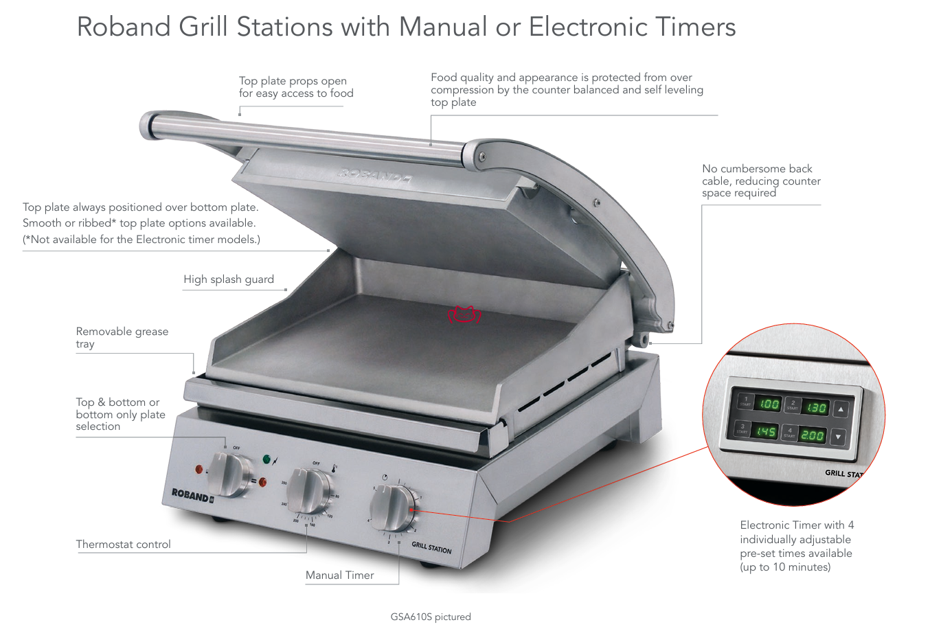 说明:GSA610SE 带电子定时(4组/最多10分钟预设),操作人员只需设定时间并开始烤制,避免人为超时或质量波动,门店培训成本低。适合连锁标准化 SOP。