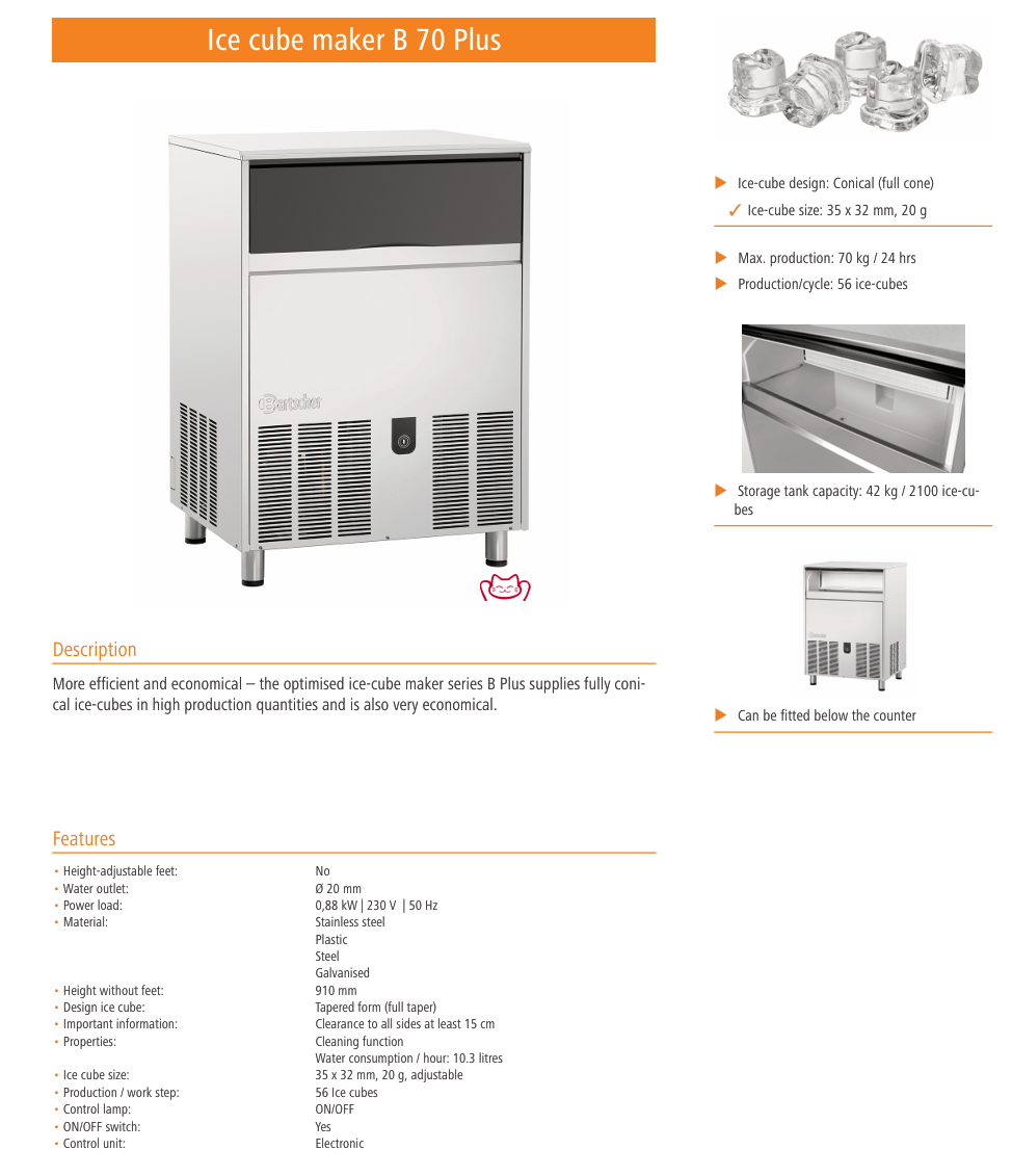 特征:更高效、更经济——优化升级的 B Plus 系列制冰机可高产量生产标准实心锥形冰块,同时兼具出色的节能性能。
