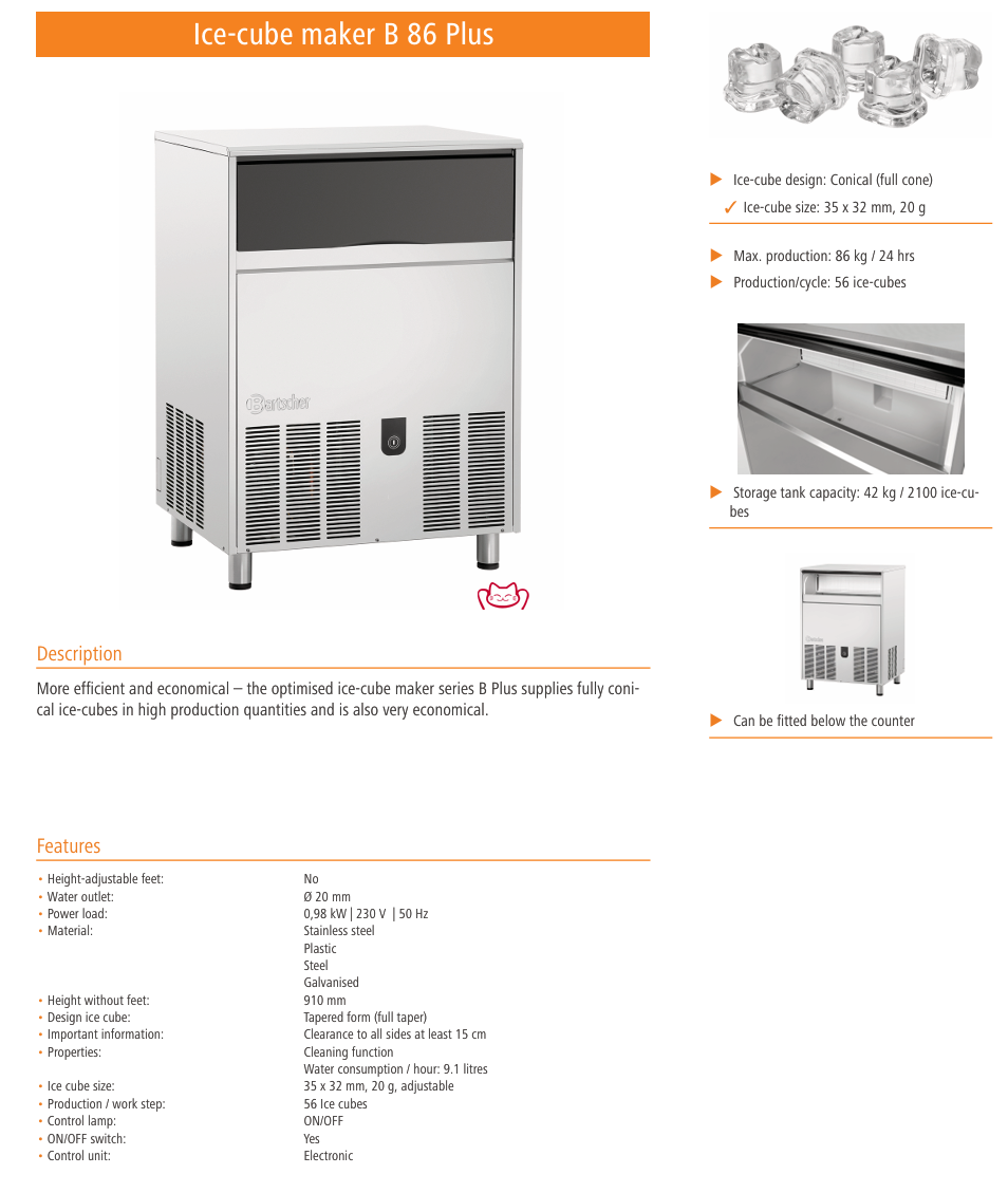 特征:更高效、更经济——优化升级的 B Plus 系列制冰机可高产量生产标准实心锥形冰块,同时兼具出色的节能性能。