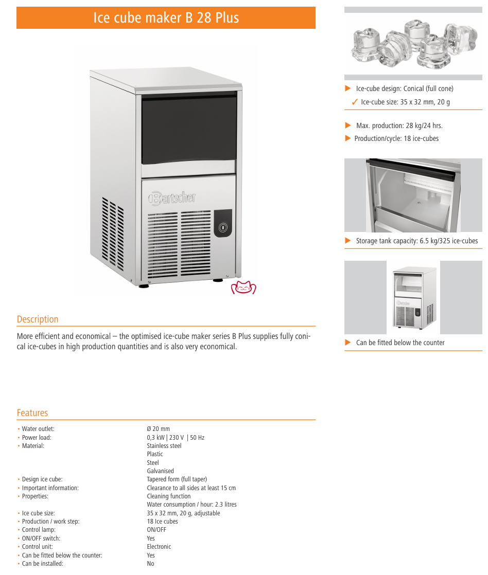 特征:更高效、更经济——优化升级的 B Plus 系列制冰机可高产量生产标准实心锥形冰块,同时兼具出色的节能性能。