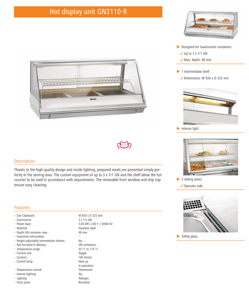 特征:凭借高品质的设计和内部照明,已准备好的餐食在取餐区域能够得到完美呈现。可定制的多达 3 个 1/1 GN 配置以及置物架,使这款热餐台能够根据需求灵活使用。可拆卸的前窗与接水盘设计,确保清洁更加方便。