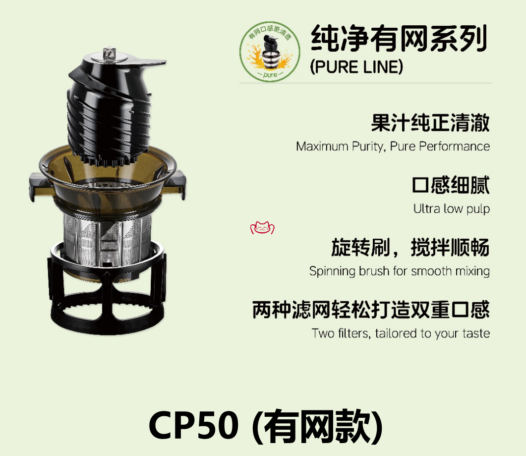 韩国HUROM CP50商用全自动蔬果冷压榨汁机(有网款) 品牌:HUROM 型号:CP50 规格:292X284X516MM 电量:220-240V 50/60HZ 250W 转速:63RPM 容量:料斗3升,前体800毫升,蔬果汁杯1.5升,接渣杯3升