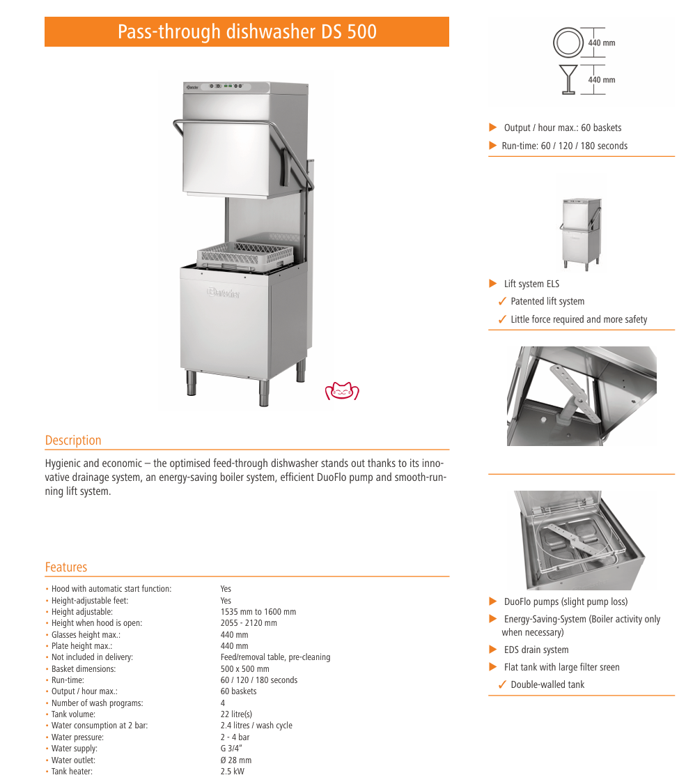 特征:卫生且经济——这款优化设计的通道式洗碗机,凭借创新排水系统、节能锅炉系统、高效 DuoFlo 水泵以及顺畅的升降系统而脱颖而出。