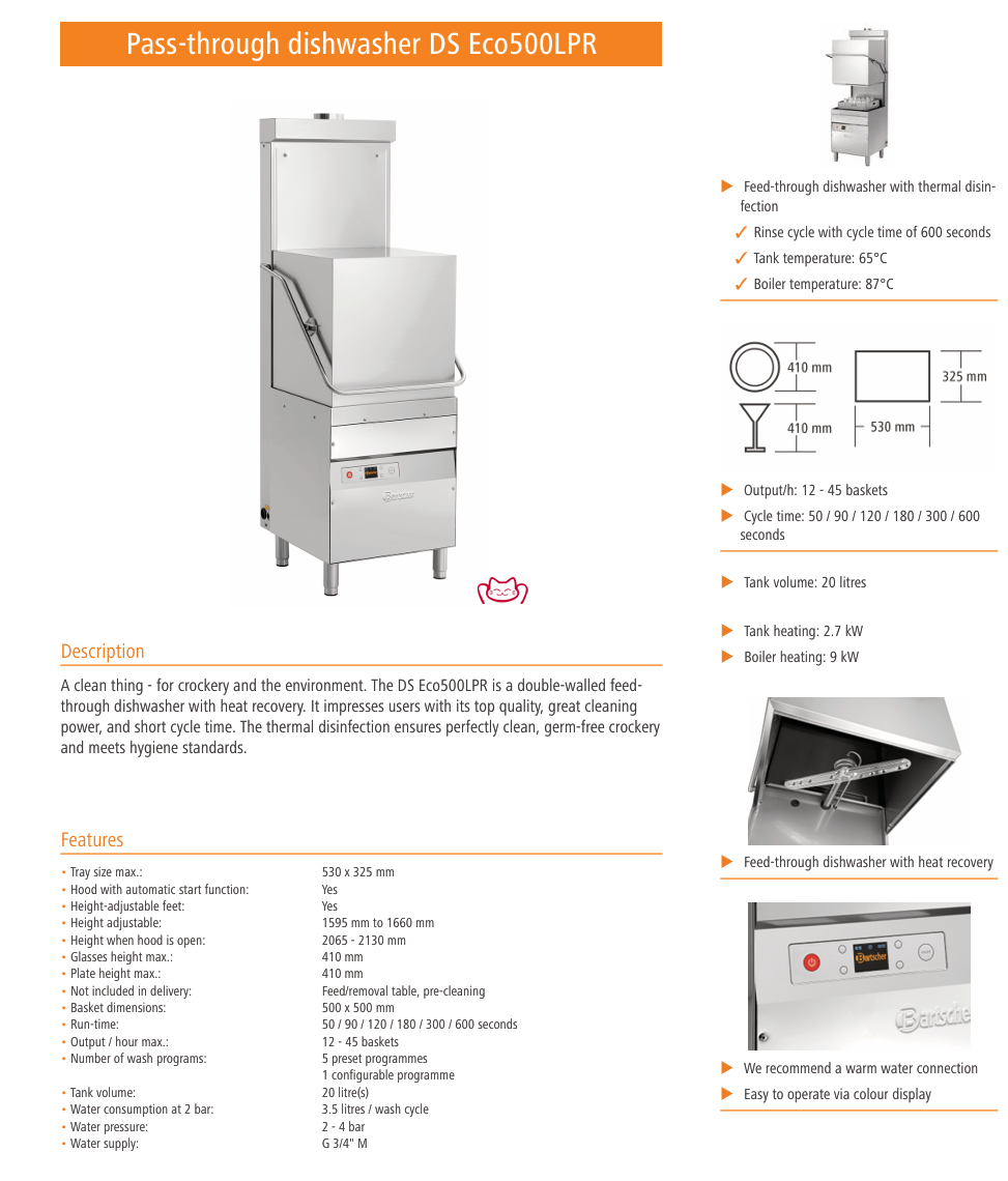 特征:干净省心——无论是餐具还是环境。DS Eco500LPR 是一款带热能回收功能的双层通道式洗碗机,兼顾清洁效果和节能环保。