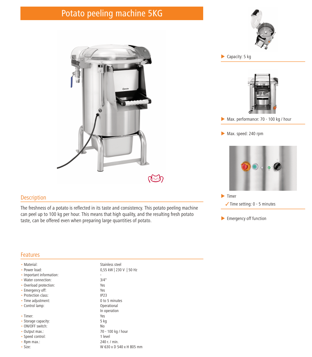 特征:土豆的新鲜度体现在其口感与质地上。这款土豆去皮机每小时可去皮 高达100 kg 的土豆。这意味着,即使在大量加工土豆时,也能提供高品质、口感新鲜的土豆。