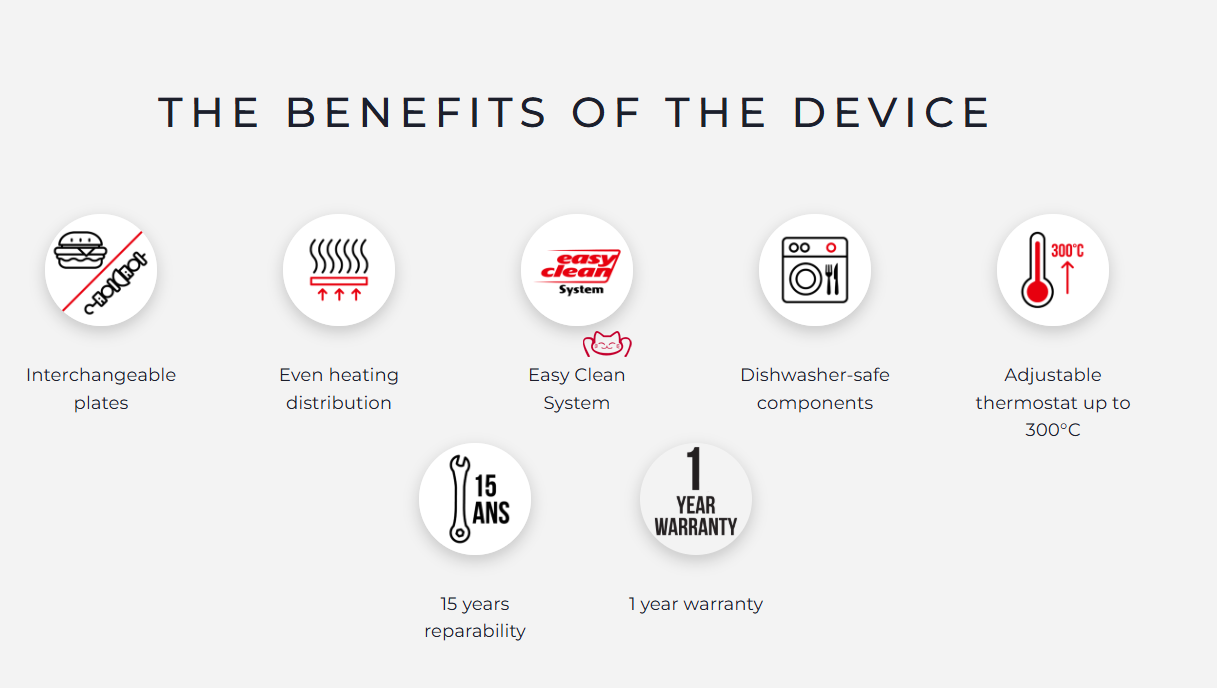 创新设计:Easy Clean 系统,烹饪板可在 45 秒内拆卸;“Heating Element Pack” 技术,确保热量均匀分布