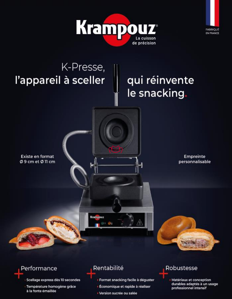 将烹饪创意与高效运营完美结合,Krampouz 推出的全新 K-Presse 封口机顺应现代小吃餐饮趋势。该设备既适用于偶尔使用,也适合高强度运营,可对各种面包进行填充与压封,制作出便于携带的创新产品,无论甜味或咸味版本都同样美味。
