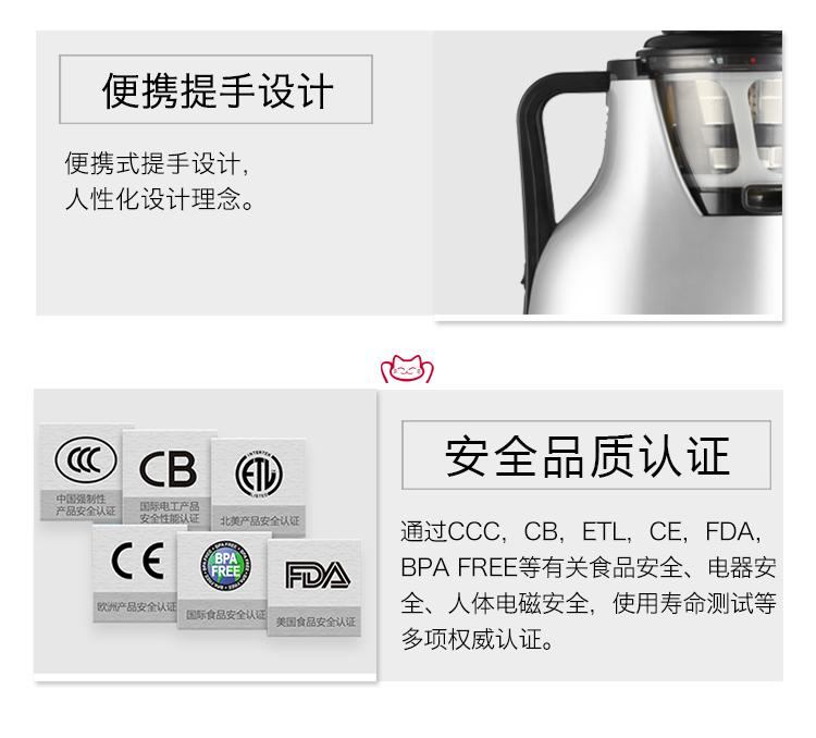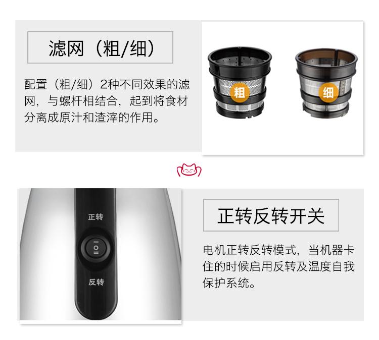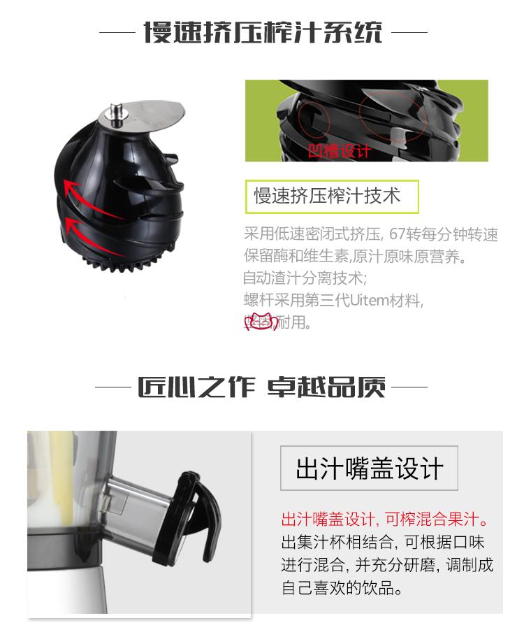 特征:原汁机慢速挤压榨汁系统,金属表面,坚固的ULTEM螺杆,榨汁滤网,不氧化, 不分层,强劲动力,静音设计,易清洗,不留污,出汁嘴盖.