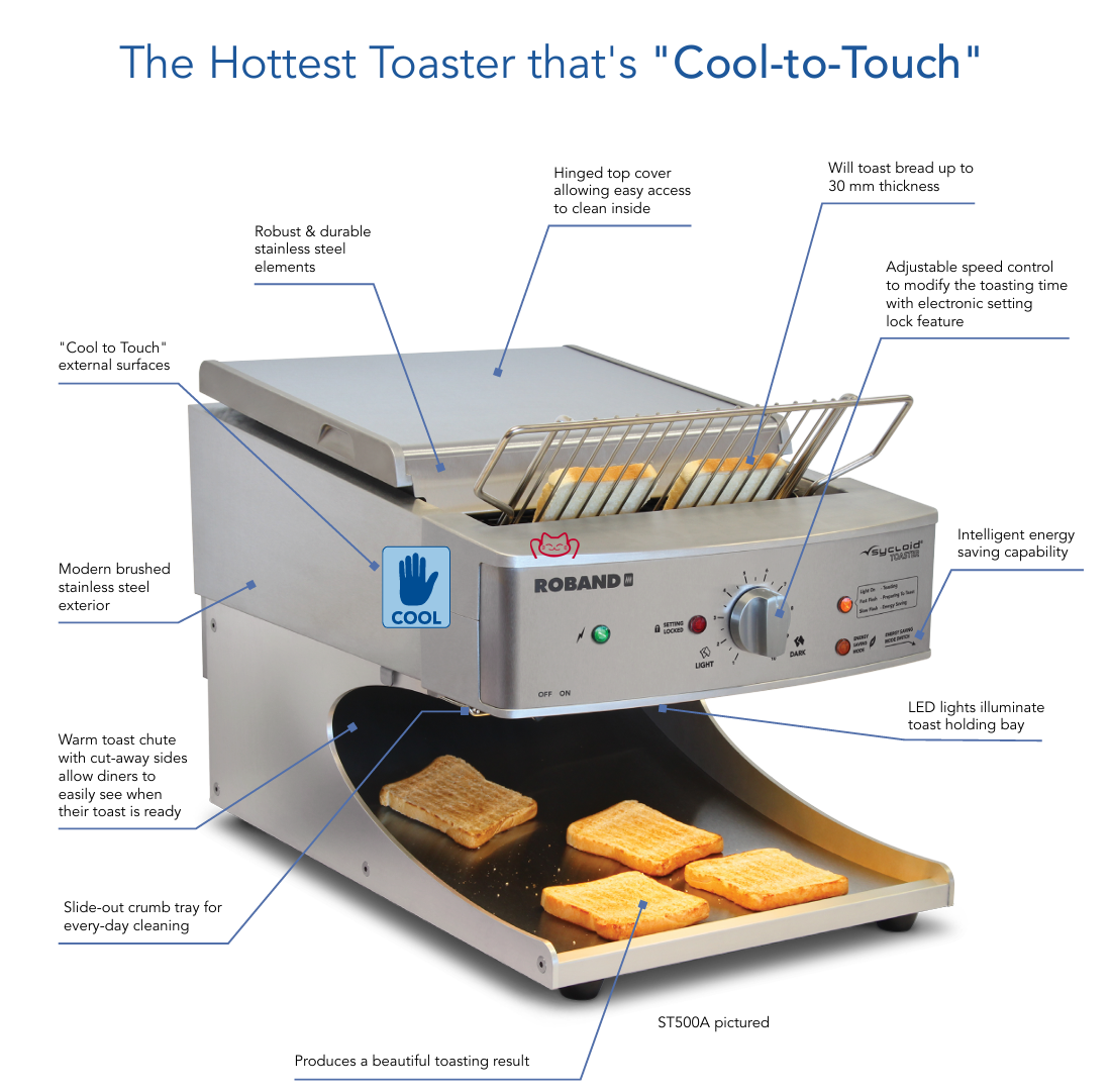ROBAND ST500AB 链条式多士炉 — 为高峰早餐和开放厨房而生。Sycloid® 系列高效链条式多士炉,500片/小时产能,冷触安全、智能节能、前台自助与后厨峰值供应的首选设备。