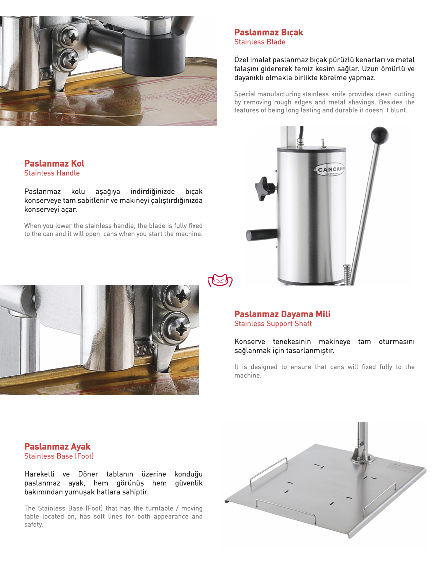 -不锈钢压臂: 压下不锈钢杠杆后,刀片稳固地固定在罐体上,机器启动后即可完成开罐。