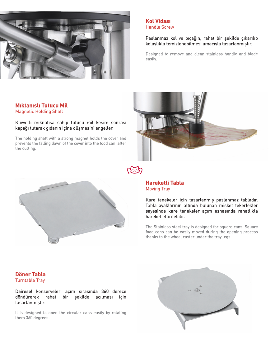-磁性固定轴: 强力磁性轴可吸附罐盖,防止切割后掉入罐内,确保食品安全。