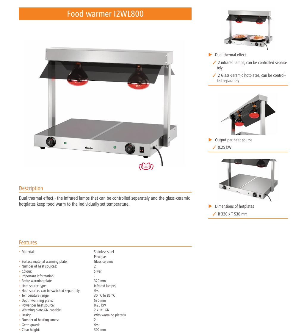 特征:双重热效应——可单独控制的红外线灯和玻璃陶瓷加热板可将食物保温至单独设定的温度。