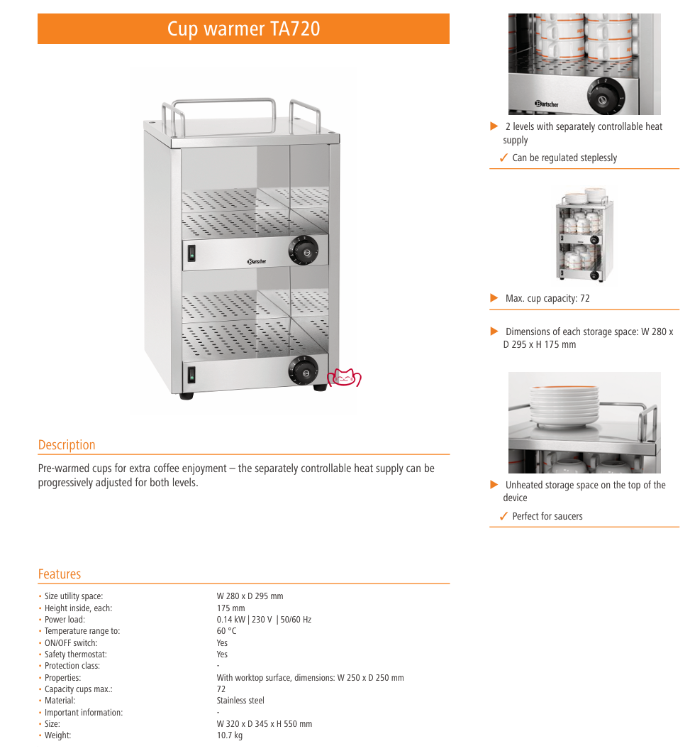 A3:产品工作台面 250×250 mm,内高每层约 175 mm,双层可放置不同杯型(espesso、latte、macchiato)。上部通常带有防滑导轨或不锈钢围边,避免杯具滑落。为安全起见,建议避免将超薄玻璃直接放在加热面上(任何杯暖在使用薄玻璃器具时都应注意)。