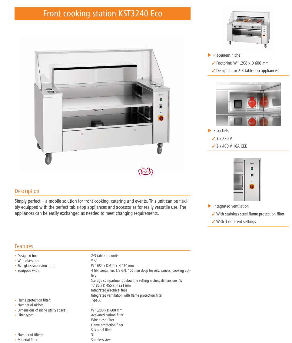 特征:简洁完美——一款适用于前台烹饪、餐饮和活动的移动解决方案。该工作站可灵活搭配各种台面设备和配件,实现多用途使用。设备可根据需求轻松更换,以适应不断变化的要求。