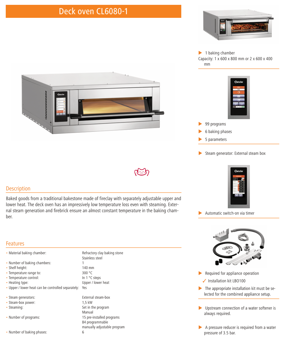 A1:适合且收益明显。CL6080-1 属于单层专业烘焙层炉,单次可放 1×600×800 或 2×600×400 烤盘,温度最高 300°C、加热功率 4.8 kW,总机功率 6.5 kW(400V)。对于日销 150–600 条面包/款的精品面包房或中央厨房的小切线,它能在保证口感与一致性的同时缩短出品调试时间,减少返工。其程序化功能能在员工交接、门店扩张时节省大量管理与培训成本。
