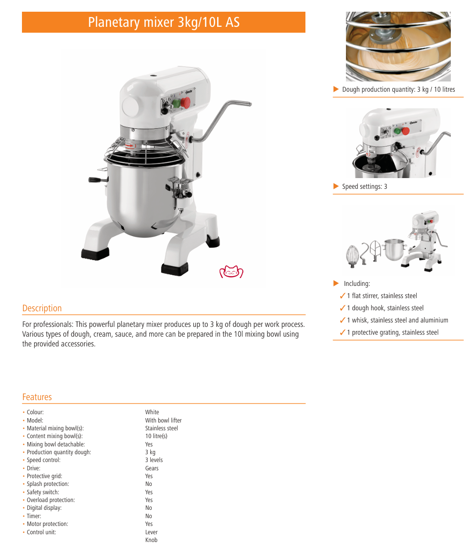 特征:针对专业人士:这款功能强大的行星式搅拌机每次工作过程可产出高达3公斤的面团。通过配备的多种附件,您能在10升容量的搅拌碗中制备各类面团、奶油、酱料等。标配1个平板搅拌器(不锈钢)+1个面团钩(不锈钢)+1个搅拌桨(不锈钢主体,铝制连接部)+1个防护格栅(不锈钢).