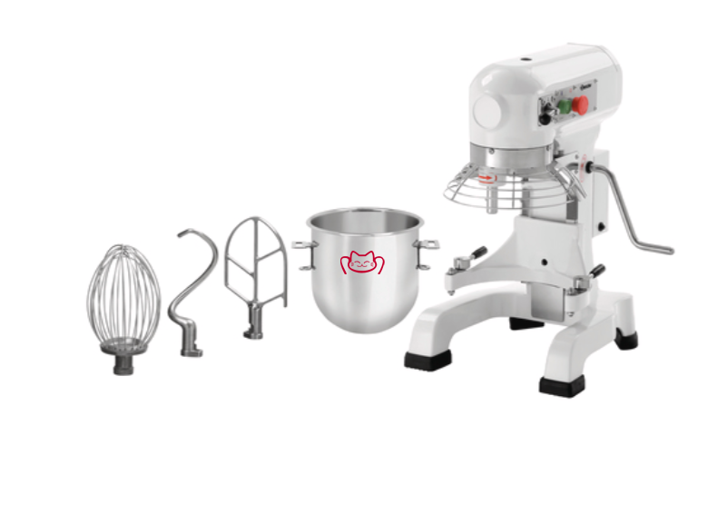 标配:平板搅拌器、不锈钢面团钩、搅拌桨(不锈钢主体、铝制连接)、不锈钢防护格栅。一个机型即可完成搅拌、打发、揉面、酱料调制,多工序切换节省台面和资本占用。