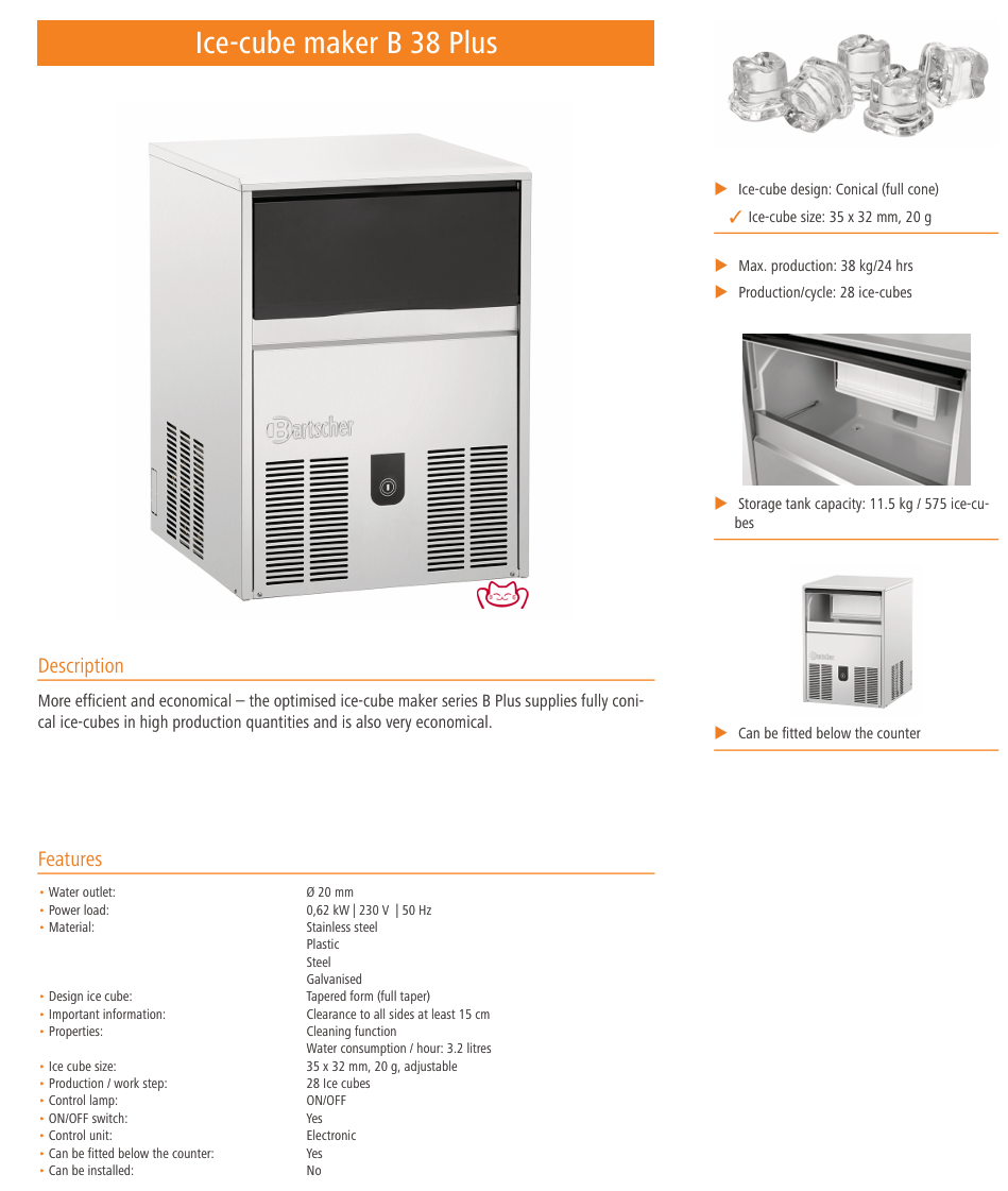 特征:更高效、更经济——优化升级的 B Plus 系列制冰机可高产量生产标准实心锥形冰块,同时兼具出色的节能性能。