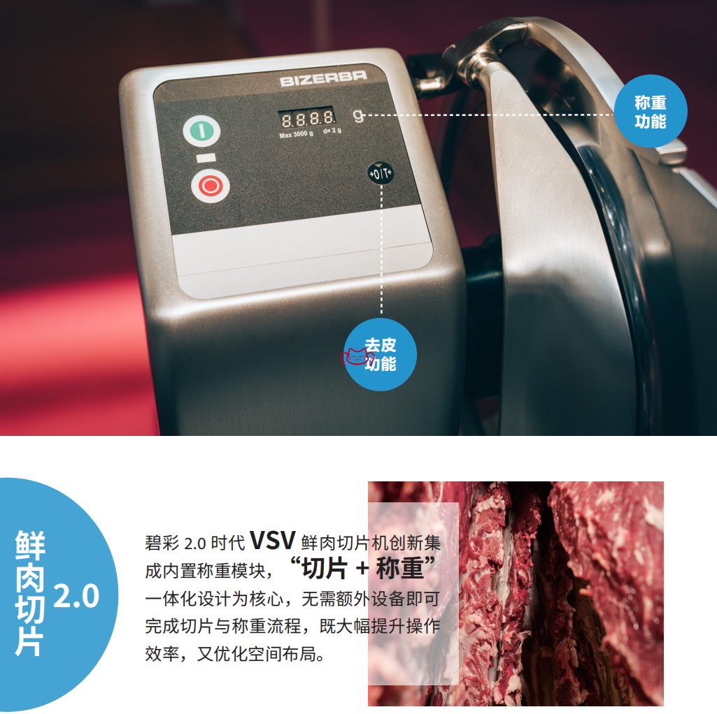 特征:碧彩 2.0 时代 VSV 鲜肉切片机创新集 成内置称重模块,“切片 + 称重”一体化设计为核心,无需额外设备即可完成切片与称重流程,既大幅提升操作效率,又优化空间布局。