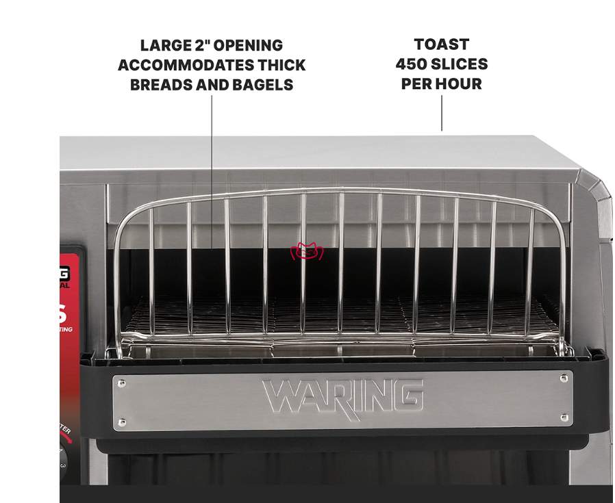 A4:支持百吉饼和厚切吐司(2 英寸开口),但冻面包建议先解冻或适当降低传送速度以达成内部回热与外皮上色的平衡。实践中建议在试运行阶段对常用菜单做 5–10 次调速试验记录最优参数。